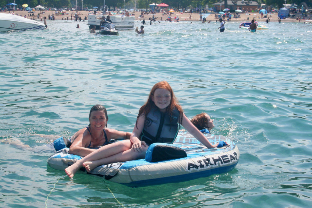 Sunday, we celebrated the dads with homemade eggs benedict made by Sam and Lori. Delicious! We headed out on the river in their sweet surf boat and drove up to Lake Huron. We anchored by the beach and ate lunch and played in the water. Sam and the girls entertained us all by being super goofy. After lunch, Sam and Elia taught Kevin and I how to surf behind the boat. It was pretty fun. When you get up on the board, you pull yourself into the wave pocket so that the board is almost touching the boat. They had awesome speakers so that the surfer could select their favorite music to surf to. I got to surf while rocking out to Black Sabbath behind the boat! Kevin couldn’t get enough of the boat surfing and definitely got the award for most turns. Elia is so good that she can completely let go of the rope and stay surfing in the pocket of the wave. So cool!