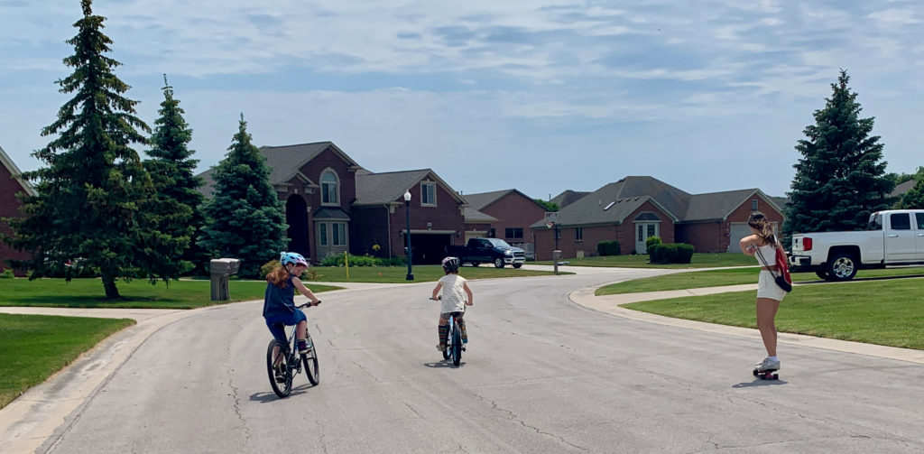 Our first day, we walked, biked, and skateboarded downtown for lunch at the War Water Brewery and some well-earned ice cream. We sat overlooking the St. Clair River, a giant river that is the border between USA and Canada. On both shores there is an interesting mix of beautiful riverfront homes with large, lush lawns, industrial smokestacks, and big ships heading in and out of Lake Huron. After our long walk, we enjoyed a nice evening swim at the St. Clair Golf club.